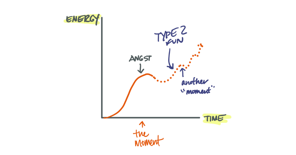 As it so happens, this is the definition of Type 2 Fun and it’s something I talk about in my book (Did I mention my book?) Type 2 Fun is when you set an objective to climb a mountain or register for a race, and it sounds great at the time, it sucks during the work, and when you’ve finished, you have a feeling of massive stoke.