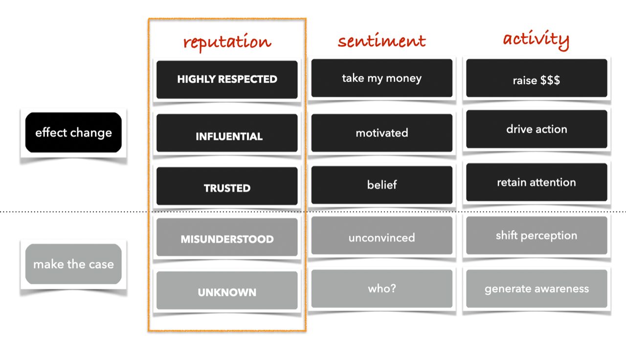 Any organization is on a journey from unknown to highly respected. At the highly respected level, you have a culture of take my money. Instead of having to make a case for something, you are essentially effecting change. And there is a lot of work and activity you are doing to get there, but if you aren’t telling the stories to your audiences, they have no way of knowing what you are doing, and you find yourself languishing in the unknown.