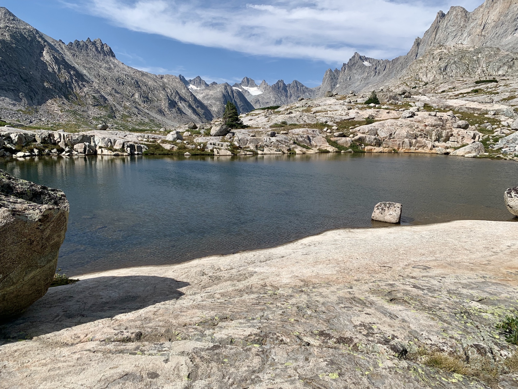 It was three days since we left the cars behind at the trailhead, and we were 18 miles from civilization. I stood at the base of Titcomb Basin in the Wind River Range, surrounded by 11000 and 12000-foot spires. We watched Harlequin duck babies floating on the water, dive to the bottom for food, and pop back up like little corks. I went skinny dipping in this pool.