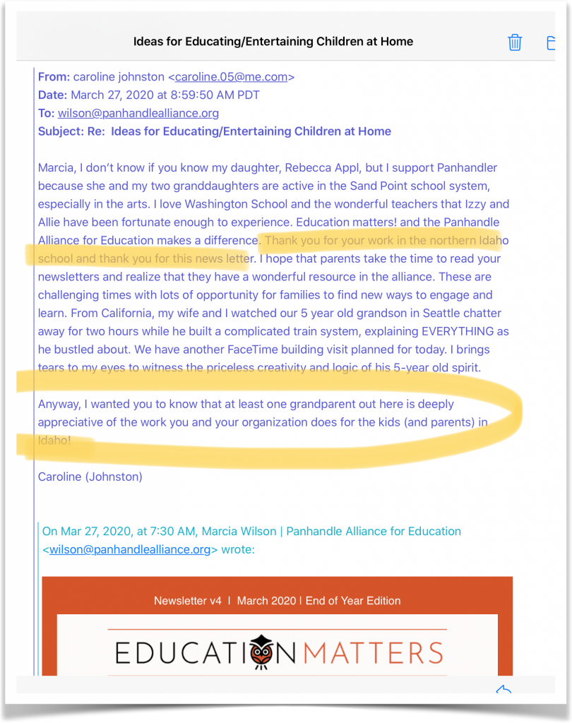 - Launched a quarterly email newsletter called Education Matters that activated a stagnant email list of 3500. Most recent email <—- read opening letter for sample of storytelling.
