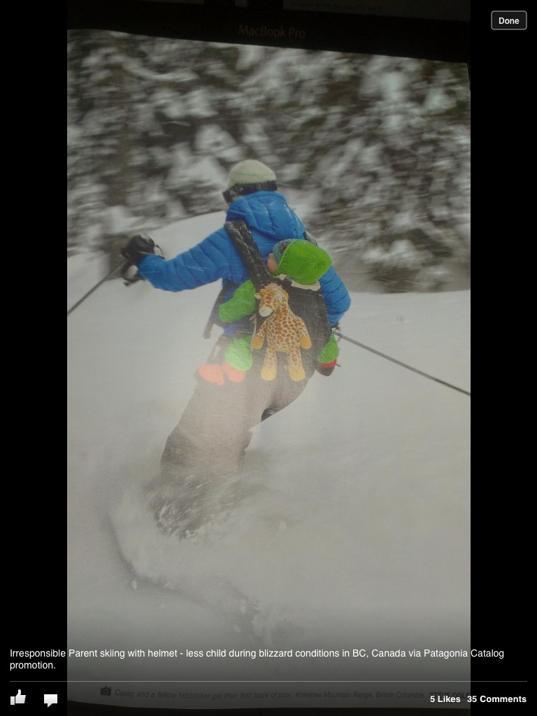 As parents of the next generation of Patagoniacs, we fully agree that it’s paramount that we protect our kids as much as we can as they explore their world. We also value the case-by-case judgement (sic) that a life in the outdoors requires and develops. Self knowledge, risk assessment, decision making and personal responsibility are qualities that define the activities we love. In this case, little Casey’s father assures us that as a veteran peak bagger, ocean swimmer and world traveler, Casey (and the giraffe) loved the powder run with Mom and returned to the cozy lodge all smiles and in perfect condition.