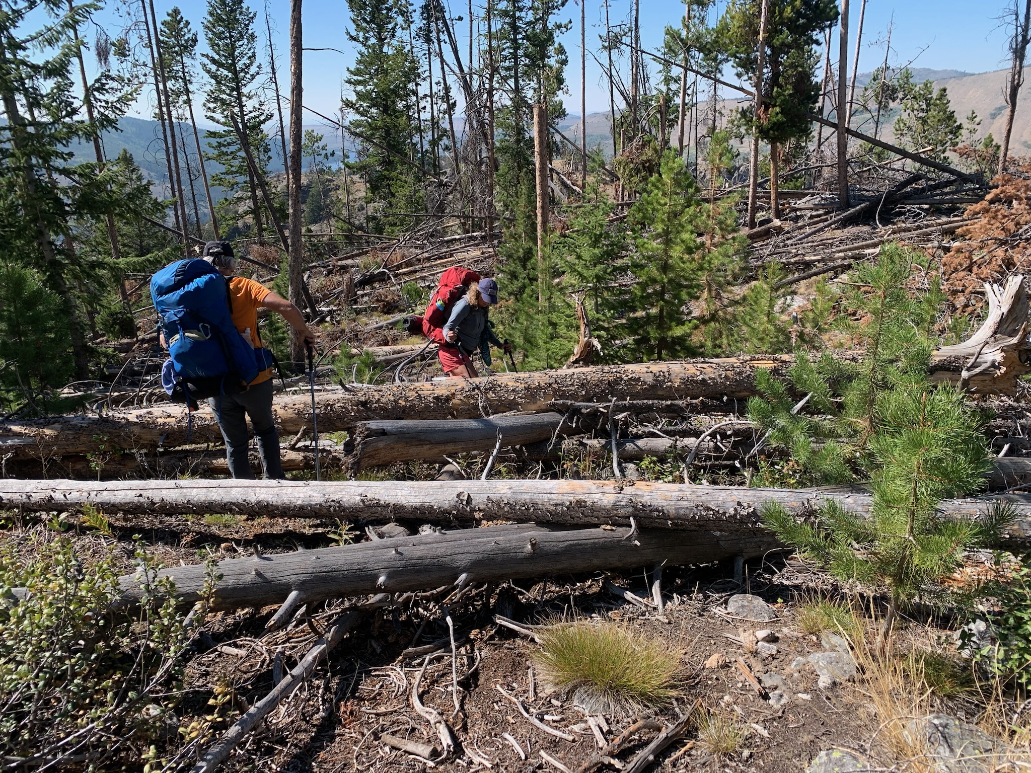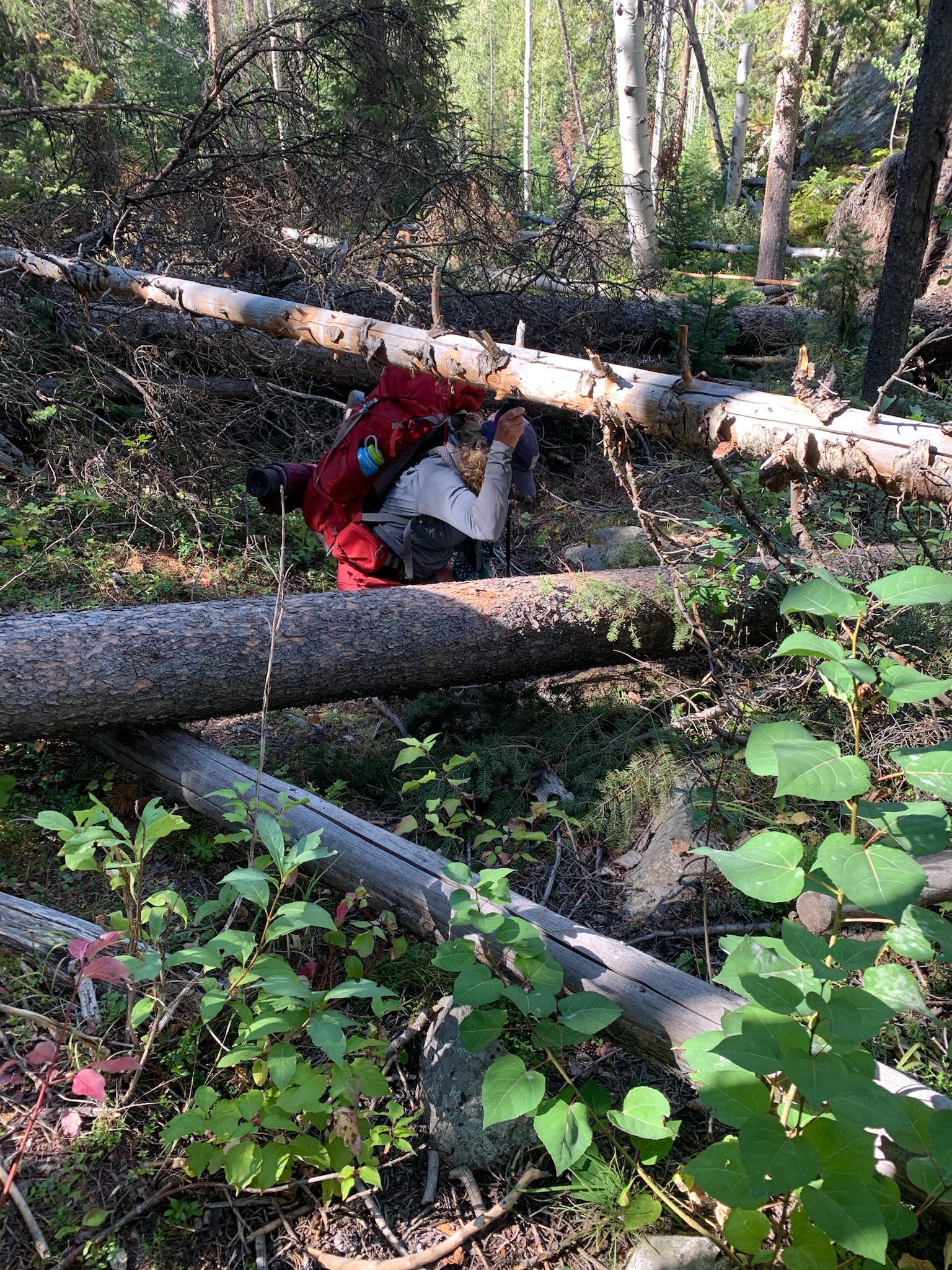 We consulted our GPS and determined we needed to take the right turn. And soon, the trail faded to nothing. We consulted our GPS and walked blindly until again we found the trail. Eventually, we found ourselves atop a ridge with no way to get to the lake we could see below other than to bushwack down the steep ridgeline that had seen a severe wind storm a few years back and was covered in tree fall. We spent hours working our way up and over trees and under, removing our packs and putting them back on as needed. We wondered how many miles we’d have to do this for. We started to get nervous. My friend had a panic attack after she hurt her hand. We took inventory of our food in case we had to spend another night out. I didn’t even want to eat, I was so nervous, but we made ourselves have something.