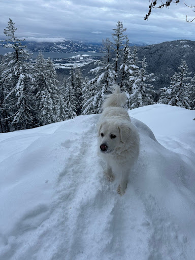 After a full day of skiing, it’s my privilege and duty to take Noli, the reluctant Great Pyrenees, for a walk. M and C accepted my invitation to join me, so we hopped in the car and drove the mile to the Viewski Loop trail. The trail is so popular that the snow track is packed down firm, and a good pair of soled boots or shoes will do. It’s a 1.5-mile loop with about 225 feet of gain up to a stunning viewpoint.